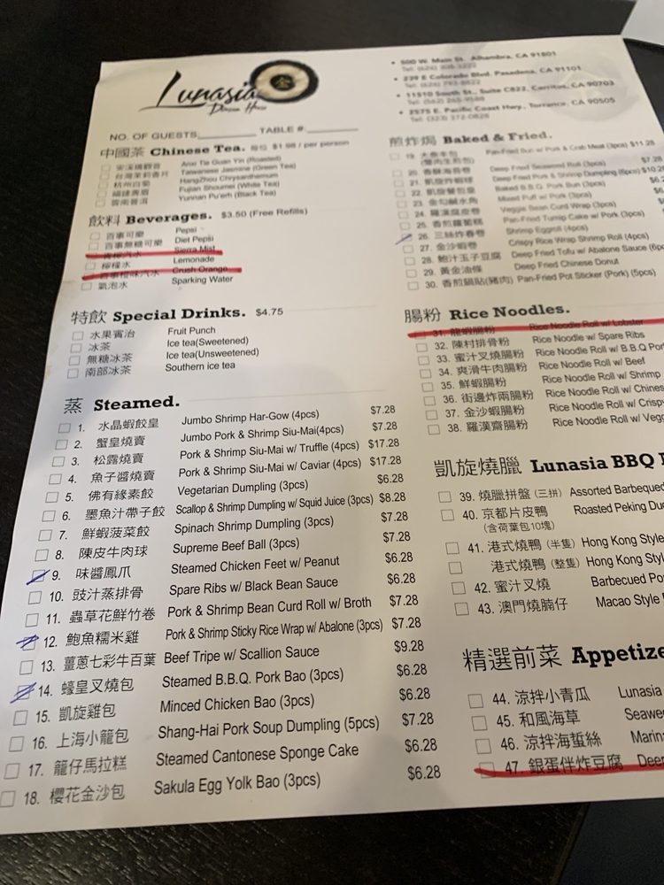 Lunasia Dim Sum House in Pasadena offers a modern twist on traditional Dim Sum with a digital menu and generous portions. The Steamed Dim Sum selection includes favorites like Jumbo Shrimp HarGow and Scallop Dumpling, while the Baked & Fried Dim Sum options feature PanFried Pot Sticker and Deep Fried Tofu Abalone Sauce. BBQ Meats like Barbequed Pork and HK Style Roasted Duck are also available. Customers praise the fresh food, great taste, and giant portions. The restaurant offers fast and easy ordering through a QR code, with supreme quality dishes that are filling. Despite some long waits and occasional item shortages, Lunasia Dim Sum House stands out as a top choice for delicious and satisfying Dim Sum dining experiences.